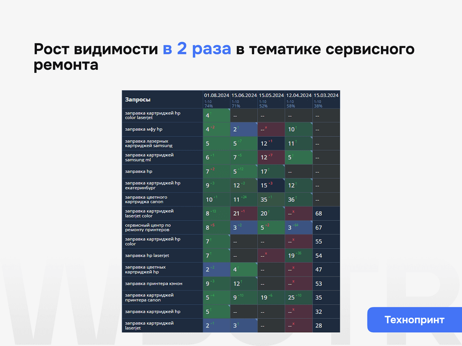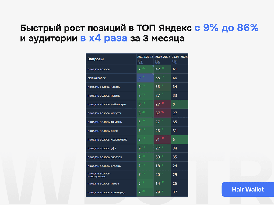 • Срез текущих позиций и видимости по приоритетным запросам